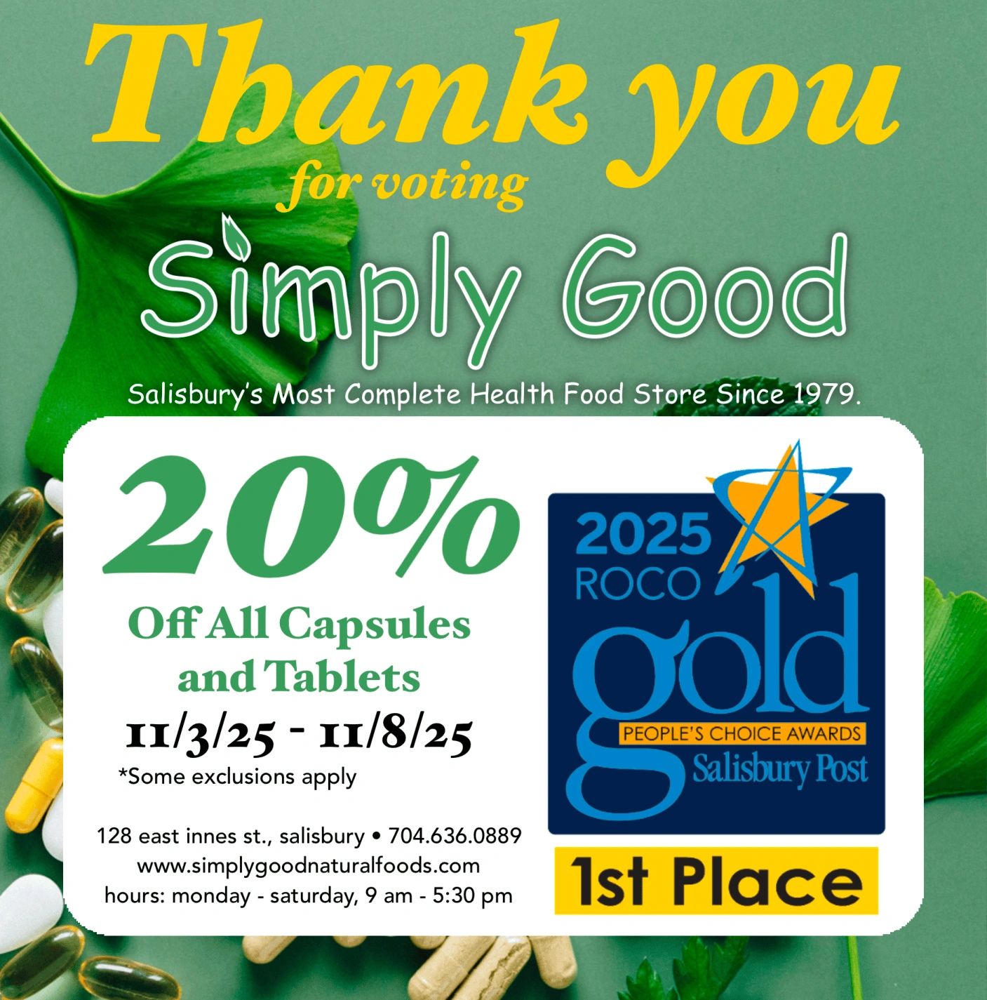 Voted Rowan County's best place to buy health/organic products by the Salisbury Post's People's Choice Awards.